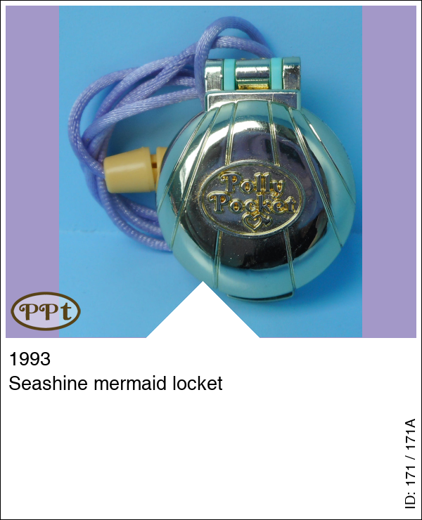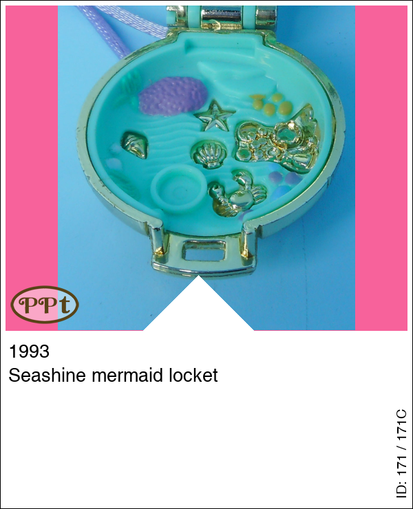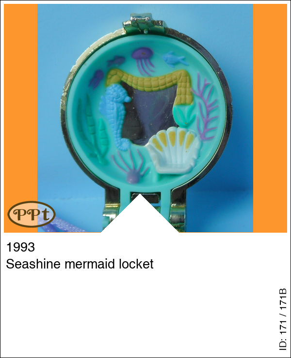 Een halsketting met hieraan een gouden doosje. Binnen in het doosje is bovenaan een lijstje met zeediertjes en een stoeltje, je kunt er ook een foto in doen. Beneden is de zeebodem met schelpjes, zeester en een krabje.