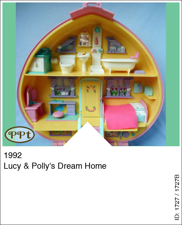 Binnenin is ook hetzelfde al een klein doosje met badkamer, slaapkamer, woonkamer en keuken alleen hier kunnen veel deurtjes open en dicht. Polly heeft op een paar plekjes een eigen zitje waar je ze kunt inklikken. Bij het raam, op de bank, in de keuken en bij het bad. Leuk om te zien. Met Lucy, Polly, kam, schoentjes en 4 pannetjes, 2 kommetjes, 1 schotel, 1 hek, telefoon, weegschaal, 2 kledinghangertjes.