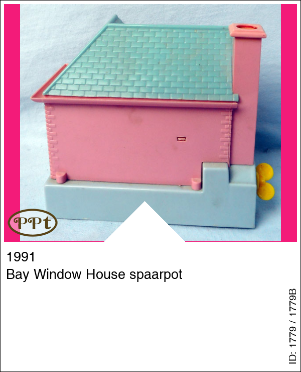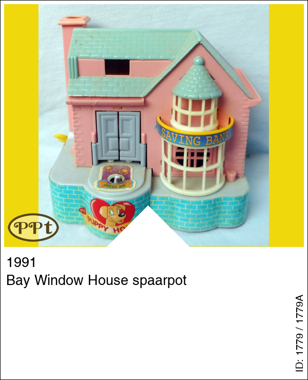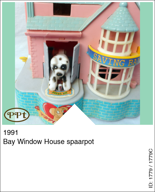 Dit is een spaarpot in de vorm van het Bay Windows House, je draait aan de zijkant aan het gele knopje dan leg je op het matje voor de deur geld weg en het hondje komt dan naar buiten om het centje te pakken.