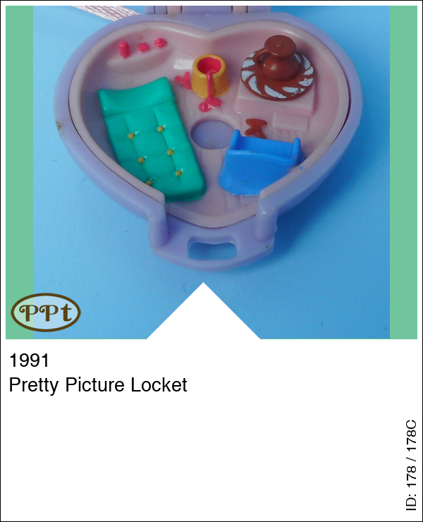 Een lila hartje als halsketting. Aan de binnenkant een schilders tafereeltje. Je ziet een groen bedje en een pottenbakkers wiel met potje en daarnaast staat een verfpotje en er staat een blauwe stoel, in het dekseltje zit een ezel met schilderijtje erop en je kan hierachter een foto van jezelf achter doen, er staan ook wat penseeltjes en wat potjes verf. Met Polly als schilder.