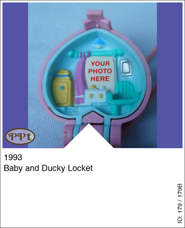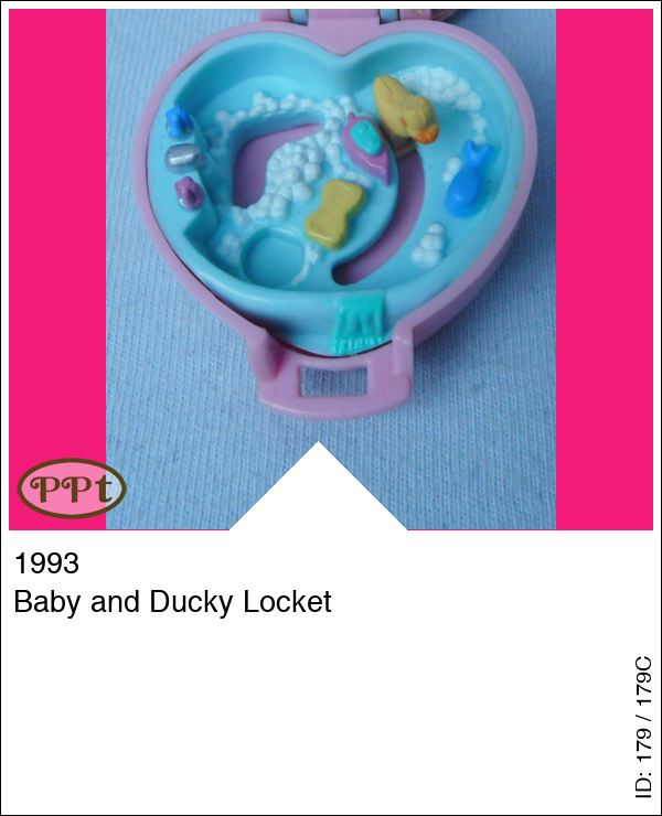 Een roze hartje als halsketting. Aan de binnenkant een kant waar je een foto kan doen en daar zie je bad spulletjes en een stoel en aan de andere kant een badje met eendje die je kan bewegen. Compleet met Polly, baby Joe met blauw luiertje en een roze ketting met blauwe sluiting.