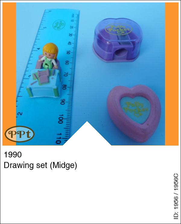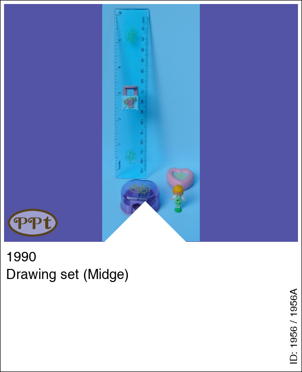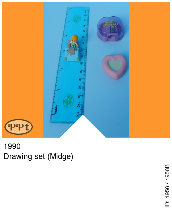 Dit is een schrijfset met Midge, en hier zie je een lineaal met daarop een tafeltje en dit zit er vast op, gum (hartje), en een puntenslijper.