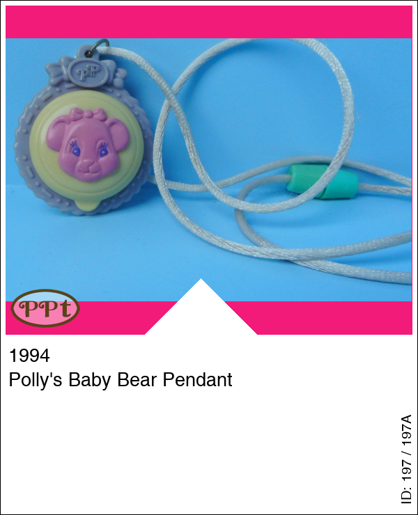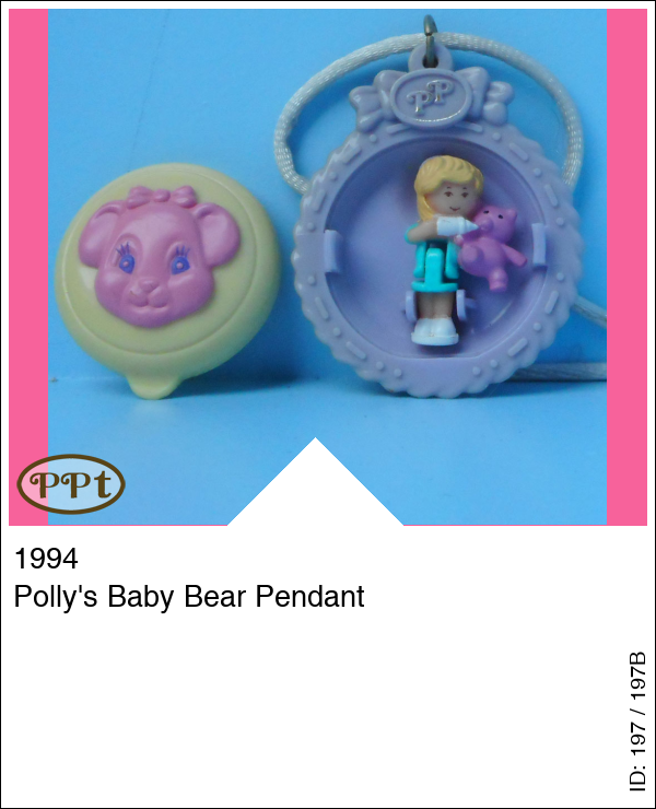 Polly's Baby Bear PendantUpdate: 17-02-2023 Een halsketting met aan de buitenkant van het geel/paarse doosje een roze berengezichtje en binnenin zit Polly met een beertje in haar armen en ze geeft de fles.