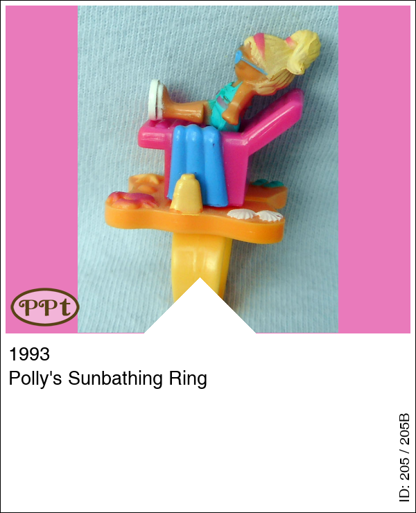 Polly's Sunbathing RingUpdate: 01-03-2023 Ring met polly die ligt te zonnebaden op een ligstoel, je kunt de ring uit elkaar halen dan heb je 3 delen en Polly met zonnebril en stoel en gele ring.