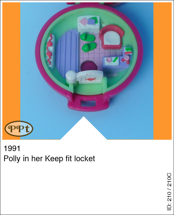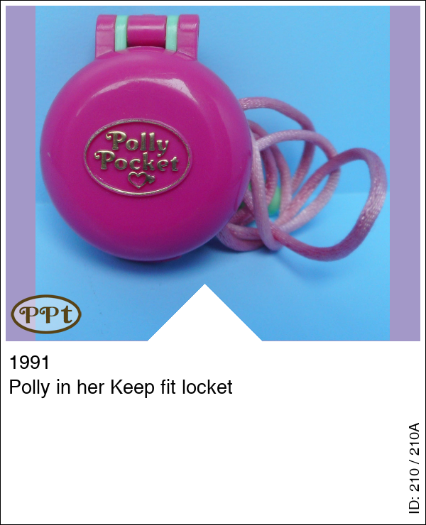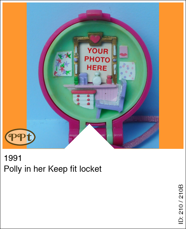 Een roze doosje als halsketting. Als je het doosje opent kan je er aan de ene kant een foto in doen. Aan de andere kant is een bureau en een fitness matje en daarvoor staan schoentjes. Met Polly en een groene handdoek op haar hoofd.