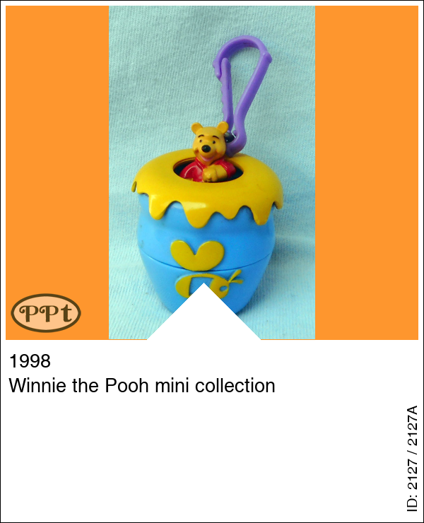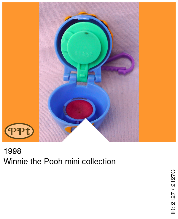 Super gaaf klein honing potje met hierin Winnie the Pooh, het is een sleutelhanger en als je de bovenkant open maakt is daar Winnie op een groen plateau en er liggen wat paarse honing potjes. Als je Winnie eruit haalt kan je dmv de stempel onder zijn poten, stempelen op het stempelkussen onder het groene plateau. Met Winnie The Pooh.