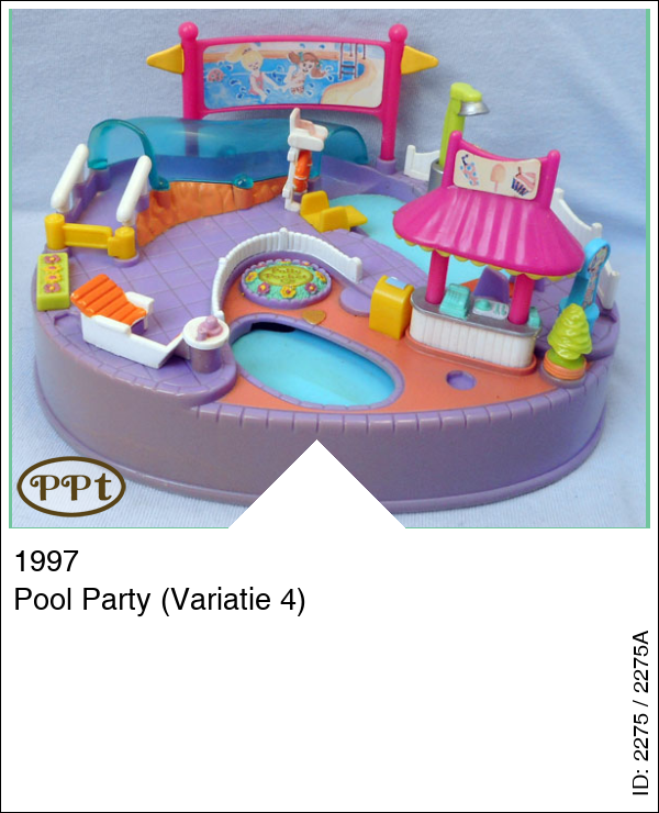 Een zwembad waar je met een polly pocket poppetje met magneet in haar voetjes heel het zwembad door kan lopen, en van de glijbaan af. De douche werkt echt door erop te drukken.