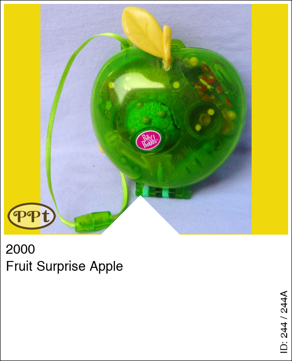 Een groene appel en als je het doosje openklapt komt de boom in het midden en als je op het gele hendeltje drukt onder de boom komt er een eekhoorntje uit met appeltje. De ene kant zie je bloemen met vlinder een schommelbank, oranje picknicktafel, 2 eendjes en een wensput. Aan de andere kant is een taart verkoop en een roze tafel en gele stoel, een groen fornuis met oven welke echt open kan en daar staan 2 taartjes in. Ook zie je een draaischijf met verschillende plaatjes.