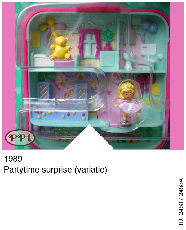 Een rose vierkant doosje met aan de binnenkant een verjaardagsparty compleet met taart en disco en cadeau wat open kan. Polly, geel beertje en rokje.