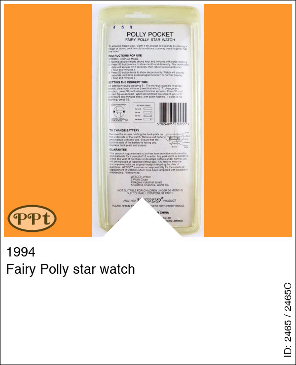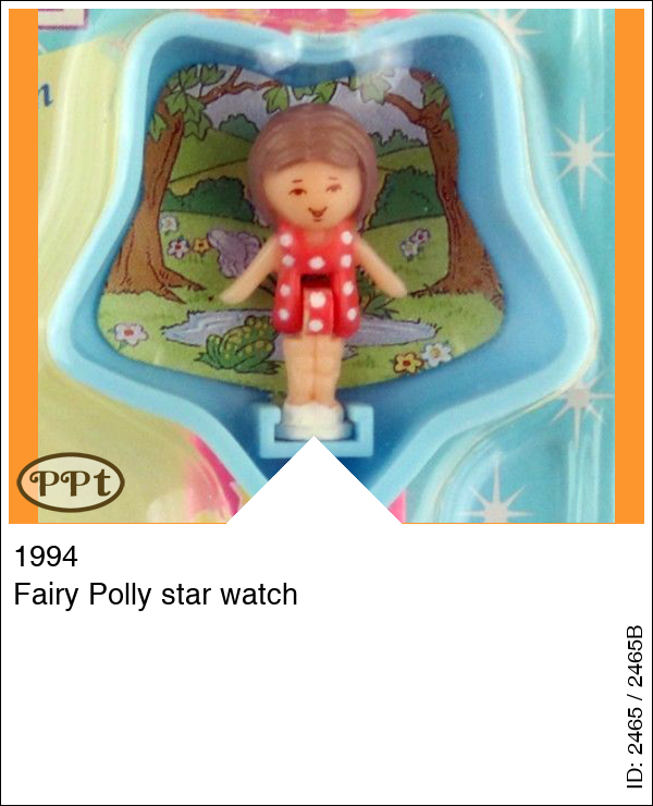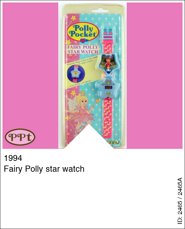 Horloge met roze band met daarop hartjes en sterretjes. Het horloge zelf is blauw en heeft de vorm van een ster. Aan de voorkant van het horloge komt Polly tevoorschijn als je het warm maakt met je hand. Met Rosie. Tekst op verpakking (warm the magic label on te watch & make a wish, fairy polly will appear)