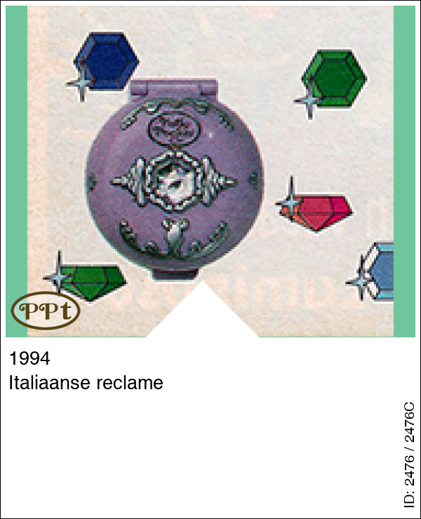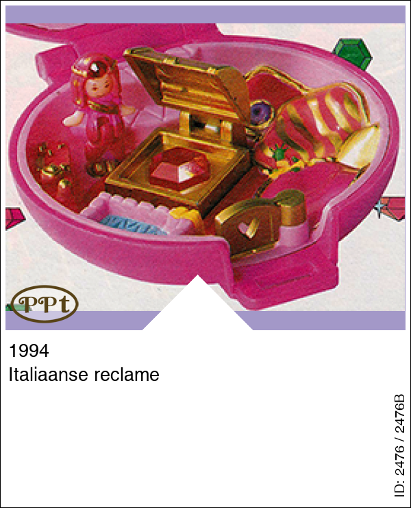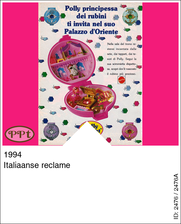 Reclame uit het italiaans blad Mezzalunarossa hier komen Jeweled palace, Jeweled sea, Jeweled forest en Jeweled iceland op voor.Bij de titel staat: Polly prinses van robijnen nodigt je uit in haar oosterse paleis.