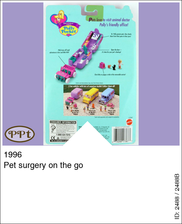 Een auto met caravan binnenin is het een dierendokter met allerlei verschillende spulletjes. Er hoort 1 poes genaamd Fluff en 1 hondje genaamd Raggle, Polly en de roze transportbox en het extra armbandje bij.