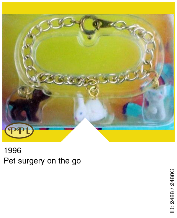 Aan het armbandje hangen een bruin hondje, wit konijn en grijs poesje.