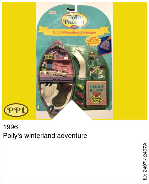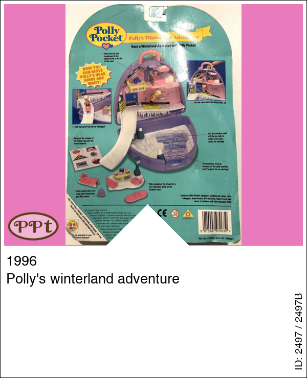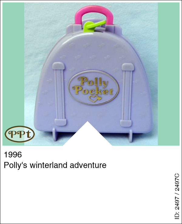 Dit is een paars koffertje met een winterse binnenkant met een skihutje met bed en balkon, een klein glijbaantje te bedienen vanaf de buitenkant en een schaatsbaantje. Het tafeltje is een los onderdeeltje en het sleetje kan ook los. Polly in skikleding, skies, slee en snowboard, stickers en het mini koffertje.