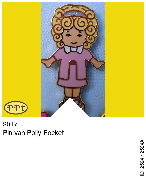 Leuke pin van Polly pocket popje in roze kleding.
