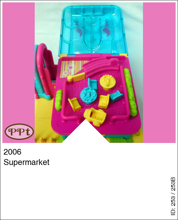 Dus dit is een winkeltje met blauw glazen lichtkoepel, hieronder zit het cafe met afhaalband voor eten/drinken en een kassa ook voor de kleintjes een vliegtuigje waar ze in kunnen en dit draait. Onder het cafe zit de winkel en als je aan het wieltje draait gaan de klapdeuren open, met diepvries die echt open kan en heel veel boodschappen, je kunt er met het winkelwagentje doorheen lopen. De band waar je de boodschappen oplegt die werkt ook echt. Aan de andere kant kun je de auto parkeren en is er ook een lift. Met een blauw winkelwagentje en losse boodschapjes, Polly en de knalroze auto.