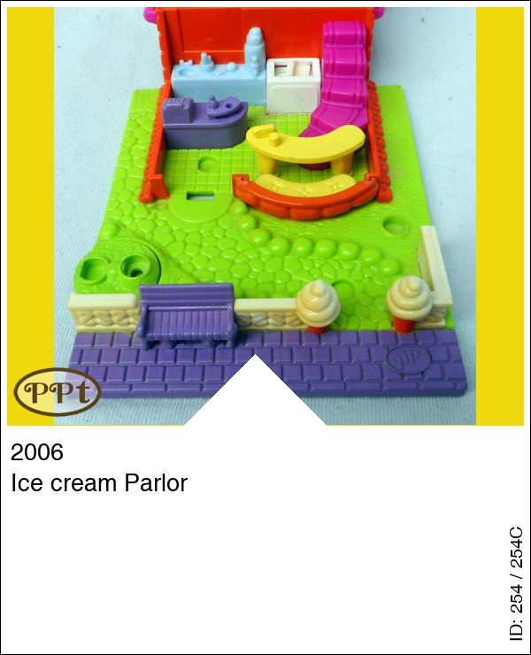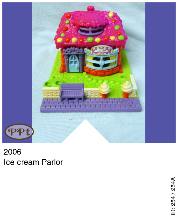 Dit is een exemplaar van de Ice Cream Parlor 2006 en dit is een speciale uitgave voor het 10 jarige bestaan.(zie extra aanvulling). Dit is een lekker knalroze ijs-winkeltje met aan de ingang 2 ijshoorntjes, een draaiplateau en een bankje. Het dakje ligt vol snoepjes. Binnen is een ijs shop met een toonbank een koelkast met ijsjes en een tafel waar je de ijsjes kunt opeten. Als je de trap oploopt dan kom je bij een cocktail bar waarvan de bar omhoog kan en daarachter is een vrieskast met deurtje wat open kan. Voor de bar staat een draaistoeltje en ja ziet een toilet met bril die echt omhoog kan. Met 1 poppetje met ijsje in hand.