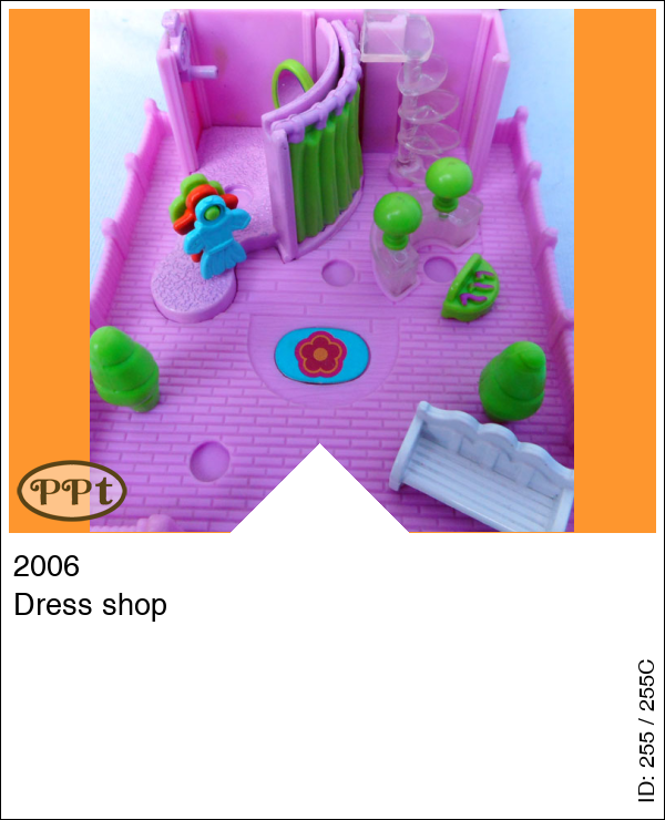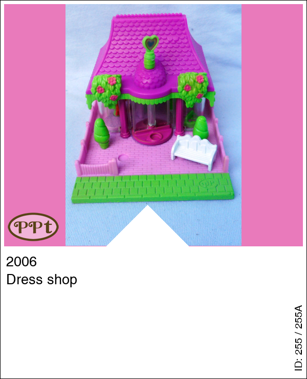 Dit is een exemplaar van de supermarket 2006 en dit is een speciale uitgave voor het 10 jarige bestaan.(zie extra aanvulling)Het is een leuk winkeltje met aan de buitenkant een bankje en 2 boompjes, als je aan het hartje draait dan gaat de draaideur bewegen. Binnen zie je beneden een pashokje en een toonbank en een rekje met 2 jurkjes die ook eraf kunnen. Ga je de doorzichtige trap omhoog dan kom je in een andere ruimte met stoeltjes een toonbankje en een plant.
