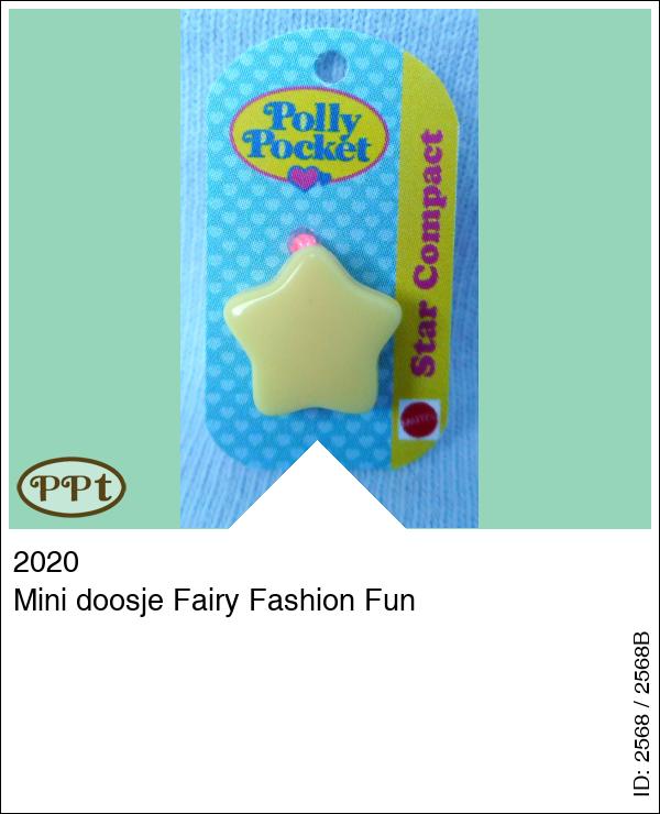 Mini doosje Fairy Fashion FunUpdate: 16-02-2023 Super leuk poppenhuis kaartje met hierop het gele ster doosje van Fairy Fashion Fun uit 1992. Het kaartje is 2,5 x 1 cm. Het doosje kan niet open helaas.