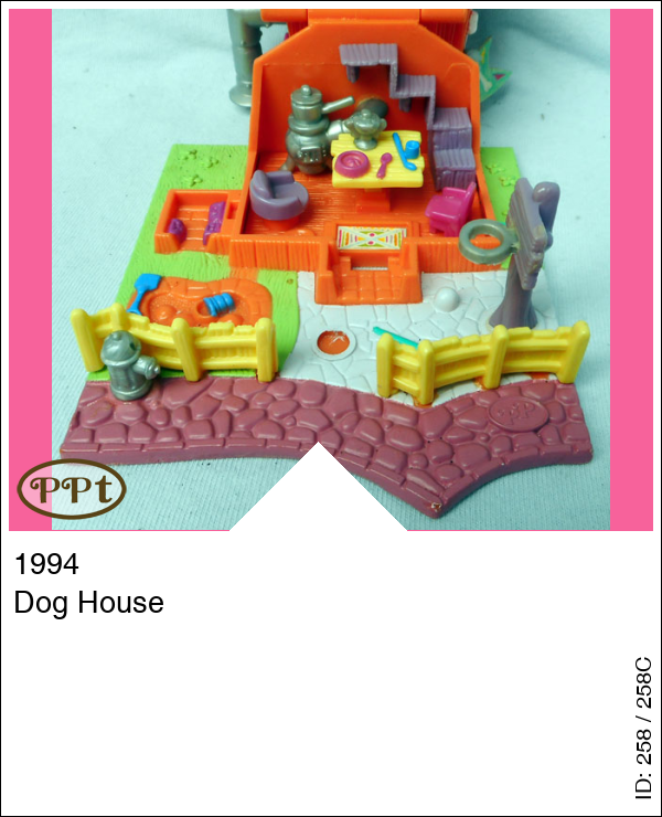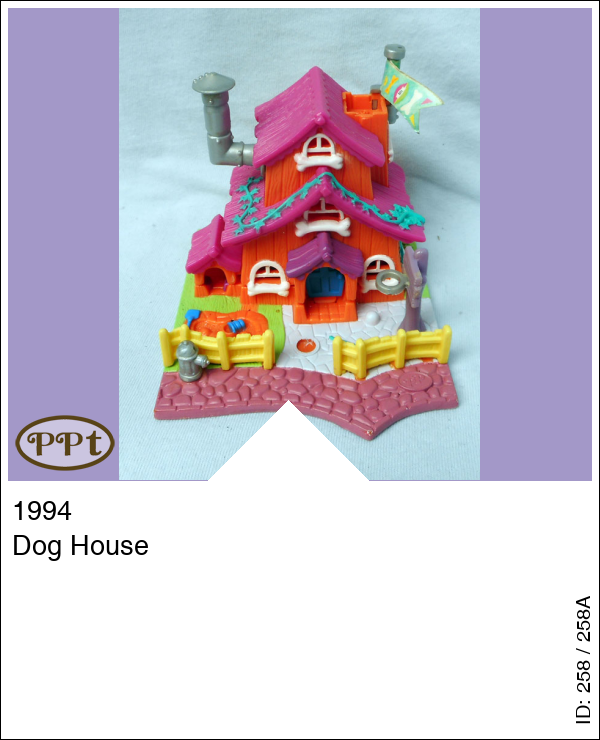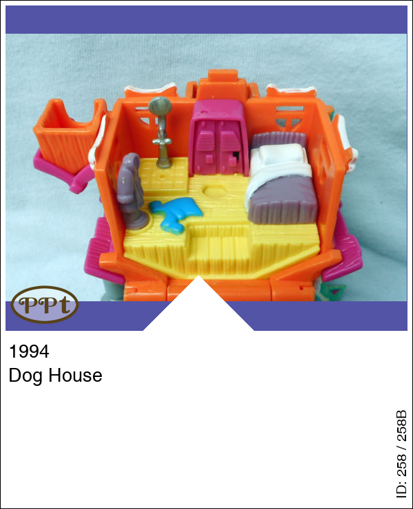 Een heel leuk oranje huisje met paars dakje. Hier leven 1 hondje en 1 kat samen met Polly. Aan de buitenkant een basketpaal, hondenhok, en brandweerpaaltje waar de hondjes tegen aan kunnen plassen, binnen zie je een woonkamer met potkacheltje en trapje naar boven waar de slaapkamer is met douche en kast (die je echt kunt opendoen). Polly, Chelsea Kitty, en Darrin Dog.
