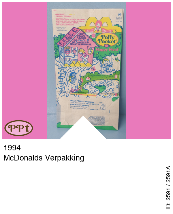 Dit is de verpakking waarin het McDonald eten in mee werd meegegeven. Er zat ook 1 van de 4 verschillende speelgoedjes in. Op de zak zie je een wandelpadje waar je moet meehelpen om Polly bij de boomhut zien te komen. Aan de andere kant staan afbeeldingen van Hotwheels.