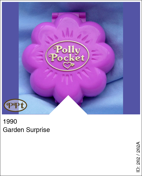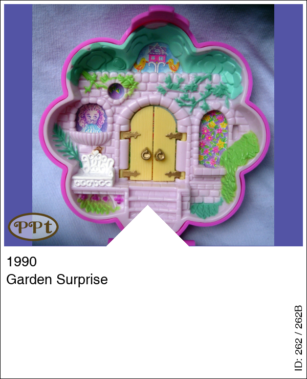Dit is een roze doosje met de vorm van een bloem en binnen is een kasteel met deuren die echt open kunnen en daarachter zie je het huis staan. Beneden is de kasteeltuin en daar is een tafel en 2 stoeltjes, een draaimolentje voor 2 poppetjes en een zonnewijzer. Ook loopt er een baantje wat beweegt en als je aan de draaimolen draait komt er een konijn tevoorschijn. Met Polly en een wit beeldje.
