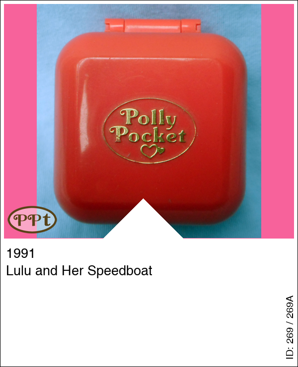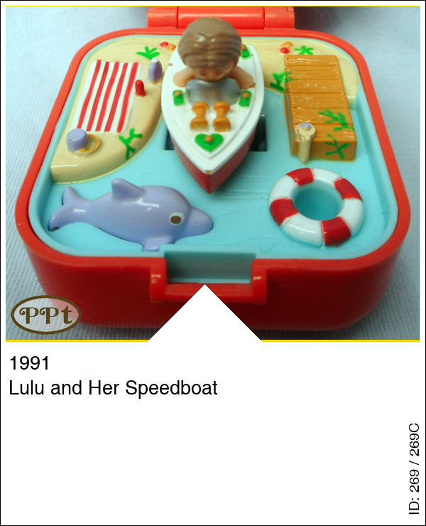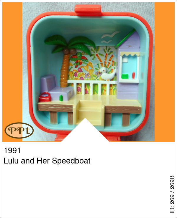 Een vierkant hoger doosje met binnen een Strandhuisje met zitbankje en een strand met aanlegsteiger. Ook zie je een dolfijn en reddingsboei waar je Lulu in kan zetten.