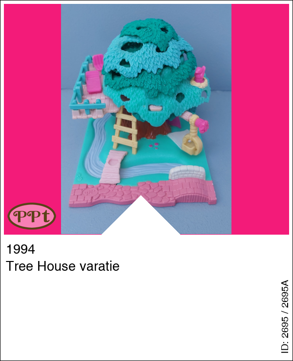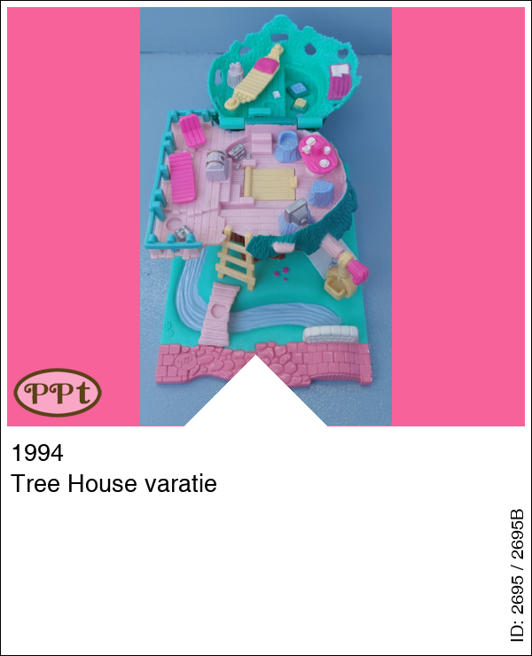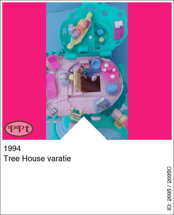 Een geweldig boomhuis met beneden een schommeltje, picknickkleed, een riviertje met bruggetje en dan ga je via het trapje het boomhuis in, je komt eerst op een terras met ligstoel en stoeltje. Je klapt de boom omhoog en dan zie je een hangmat, een paar kussens, slaapzak, en aan de andere kant een kist, radio, tv, en een tafel en stoeltjes. Ook kun je via het luik in de vloer naar beneden langs de glijbaan. Met Polly en Lulu.