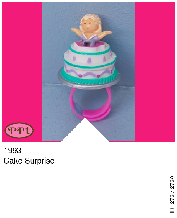 Dit is een ring met een taart en uit die taart springt Polly. Je kunt polly los doen en de taart en de ring zijn ook los.