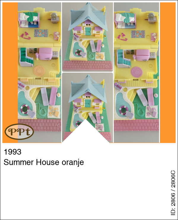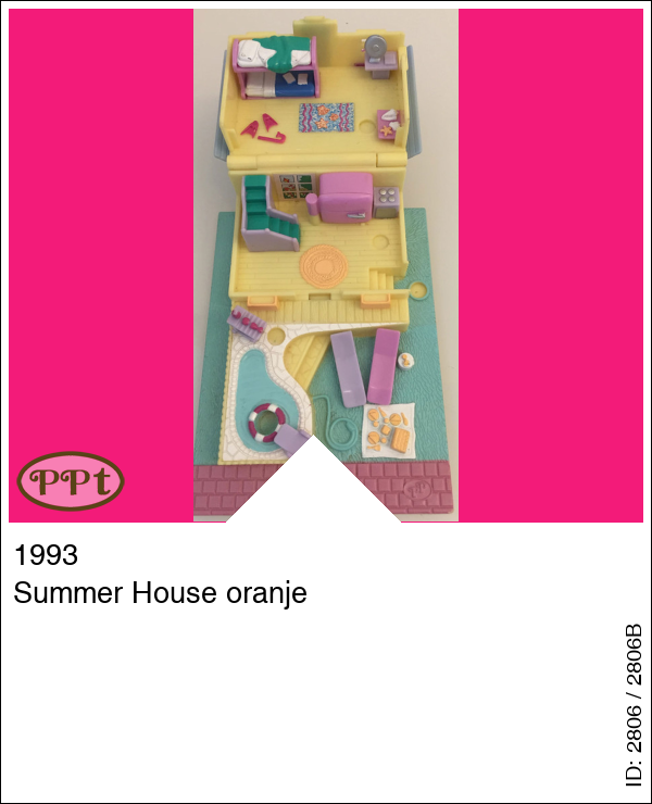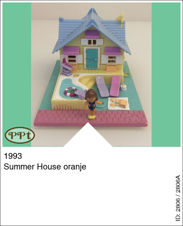 Een zomerhuisje met aan de buitenkant een barbeque en een zwembad waar het poppetje echt in kan, 2 ligbedden en een picknick-kleedje. Binnen een stapelbed en een koelkast die echt open kan. Polly en haar zonnebril en Alexia in blauw badpak.