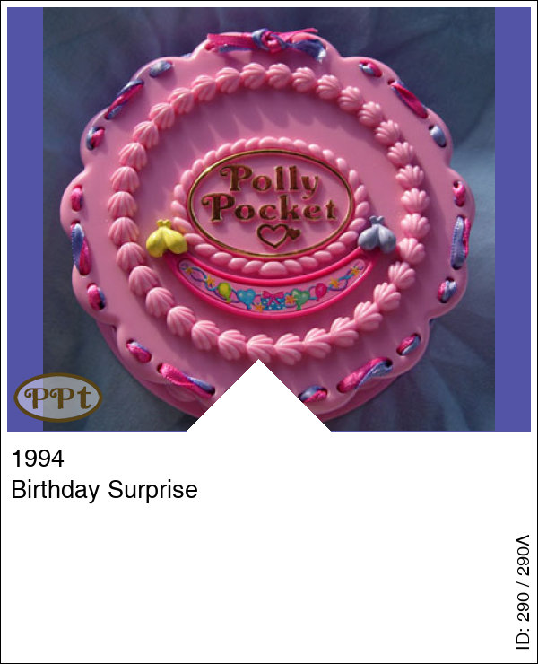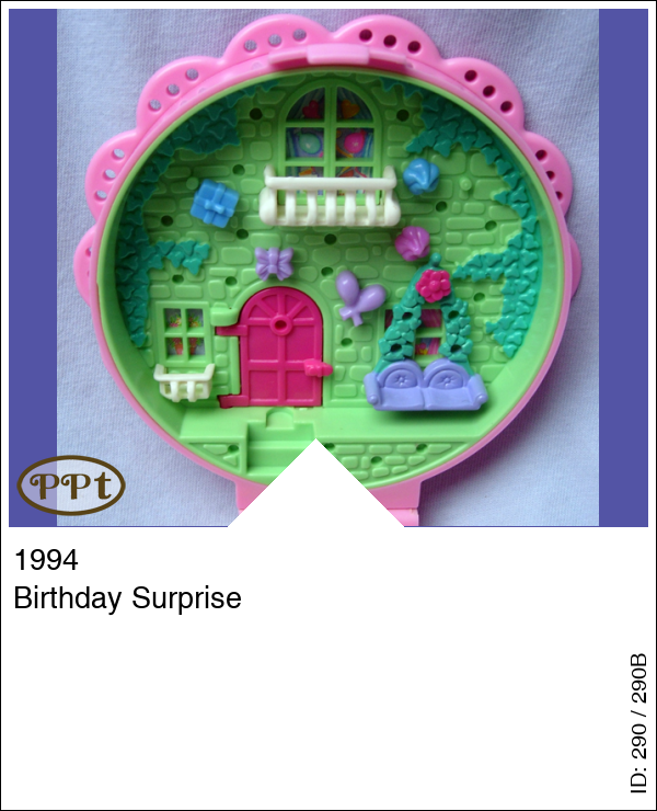 Een doosje in de vorm van een cadeau/taartje en binnenin een feestje, vooral als je het deurtje open doet en alle ballonnen ziet. Naast het deurtje een schommelstoel en boven de deur een balkon. In de tuin een wit gedekte tafel met 4 stoeltjes.De tafel kun je opendoen en daarin kunnen de ballonnetjes, strikjes, toefjes, cadeautjes, bloemetjes en hartjes. Deze pinnetjes kun je door heel het doosje prikken. Ook zie je een wit poesje wat je kan bewegen door aan het roze taartje te draaien. Met Polly, Daria, paarse en roze lint en de 30 pinnetjes