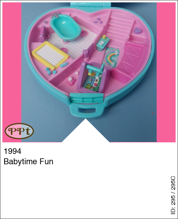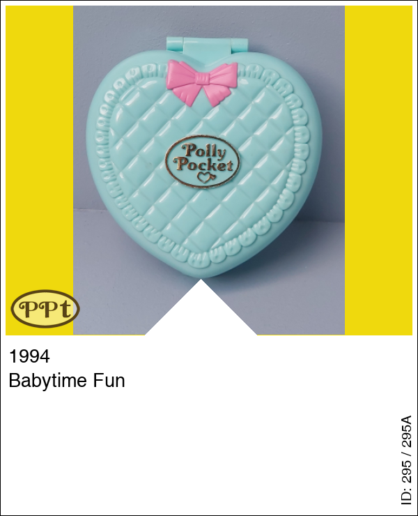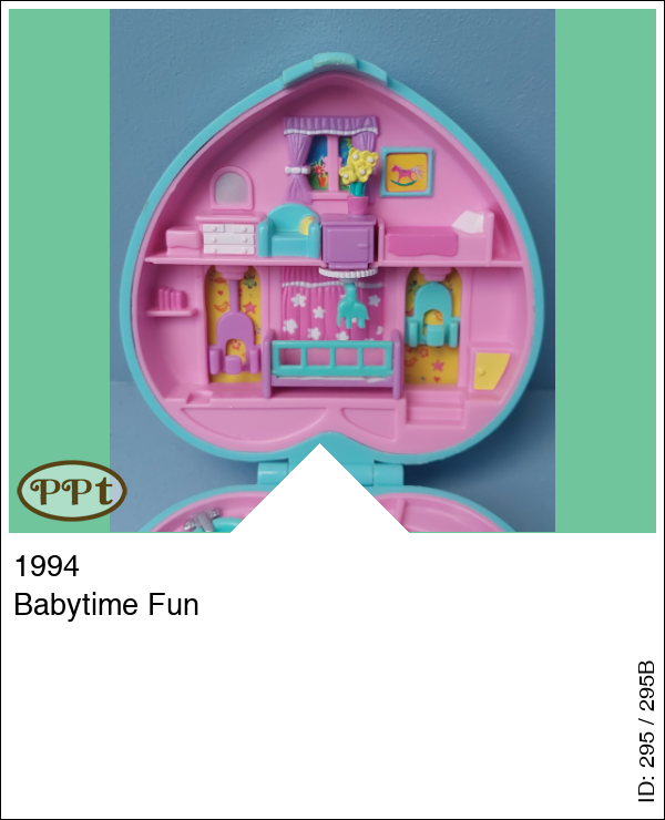 Een hartjesvorm doosje blauw/groen, en het lijkt aan de buitenkant een dekentje. Als je dit doosje opendoet dan zie je bovenaan een kinderkamer met volwassen slaapkamer en babykamer wanneer je aan het wieltje draait boven het wiegje dan gaan er aan iedere kant een schommeltje bewegen en boven het bedje draait een olifantje. Beneden zie je een speelplaats met badkamer en aankleedkussen en in de speelhoek een kleed met daarboven een speeltuigje wat echt beweegt. Met Polly en 2 baby'tjes Matt en Susie