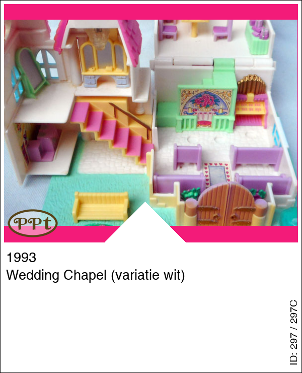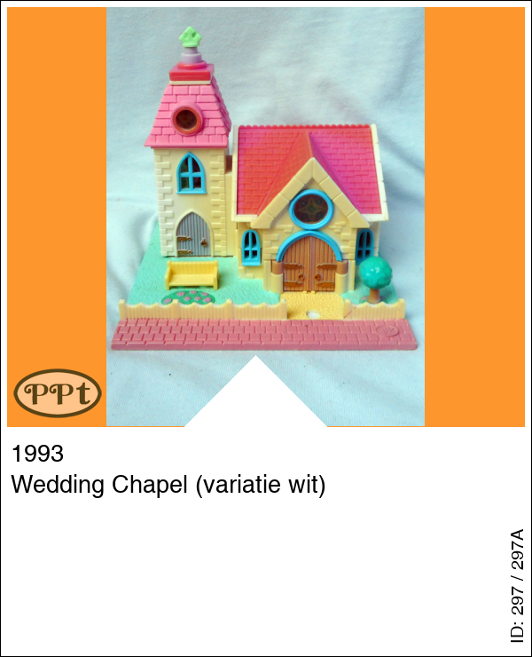 Dit trouwkapelletje is kompleet met licht en dat gaat branden als je op het groene knopje drukt wat op het torentje staat. Ik begin maar bij het kerktorentje als je dit opendoet is er een feestzaaltje met disco en een kaptafel en een spiegel, je kunt hier ook komen via de trap uit de kerk. Als je de kerk binnengaat dan zie je de kerkbanken en een altaar met orgel, achter het altaar is een trap waar je naar boven kan en daar kom je dan in een ruimte waar de bruifloft gevierd word met taart en cadeau's. Ook is daar een tafel met lichtjes (werkt) en een keukentje en toiletruimte met wastafeltje. Met de bruidegom en bruidje waarvan het onderste gedeelte van de jurk los kan, bruidsmeisje, groene kruisje.