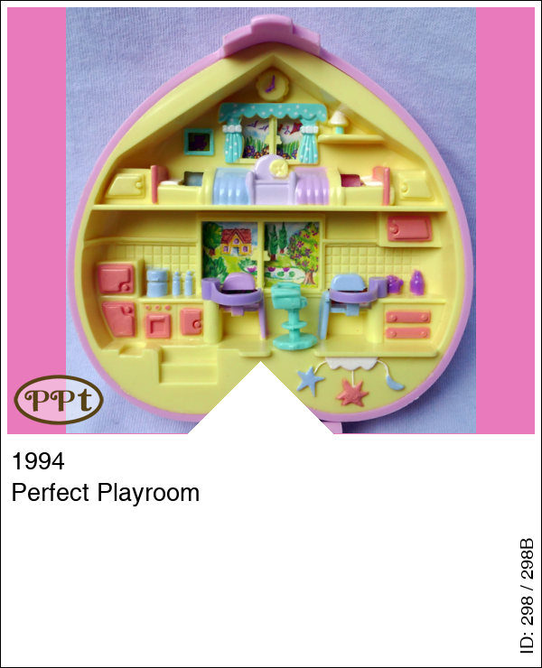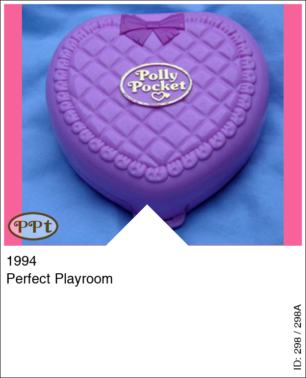 Dit is een roze doosje in de vorm van een hartje en op de deksel lijkt het op een dekentje. Als je het doosje opent zie je bovenin een kinderslaapkamer met 2 bedjes en een keukentje met kinderstoeltjes en een draaistoel voor Polly. Beneden is de potjes ruimte daar kunnen de kindjes plassen en aangekleed/verschoond worden. Ook zie je een speelruimte met hobbelpaardje wat echt beweegt en een fietsje wat echt op en neer kan rijden. Met Polly en 2 kindjes.