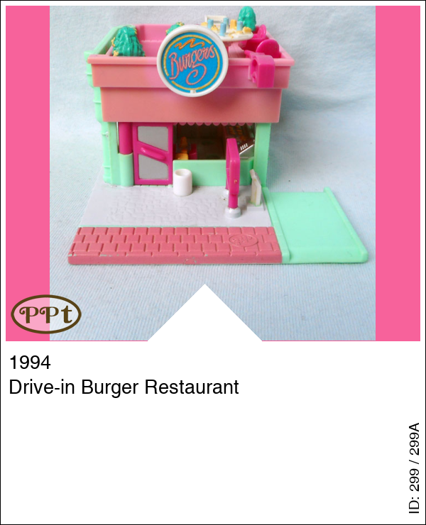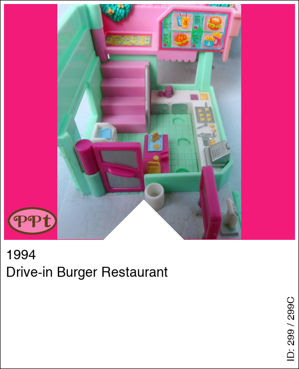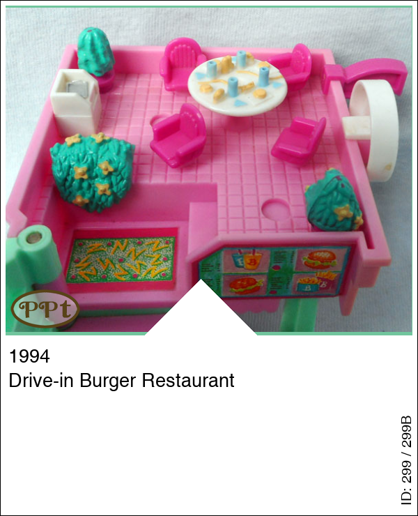Een mcdonalds huisje compleet met mcdrive. Aan de buitenkant kan je met je roze auto op het groene plateau gaan staan en daar is de lijst waar je uit kunt kiezen en de praatpaal, als je dan verder rijdt heb je daar het raampje waar je bestelling krijgt. Dit huisje schuif je naar opzij open en dan kom je aan de bestelbalie je ziet de keuken en wat broodjes en de kassa, ook staat daar de prullenbak en waar je de dienblaadjes op kan leggen. Als je de trap opgaat dan kom je op het dakterras waar een tafel staat met 4 stoelen en ook weer een prullenbak. Met Polly, Gillian, de roze auto en het trosje ballonnen.
