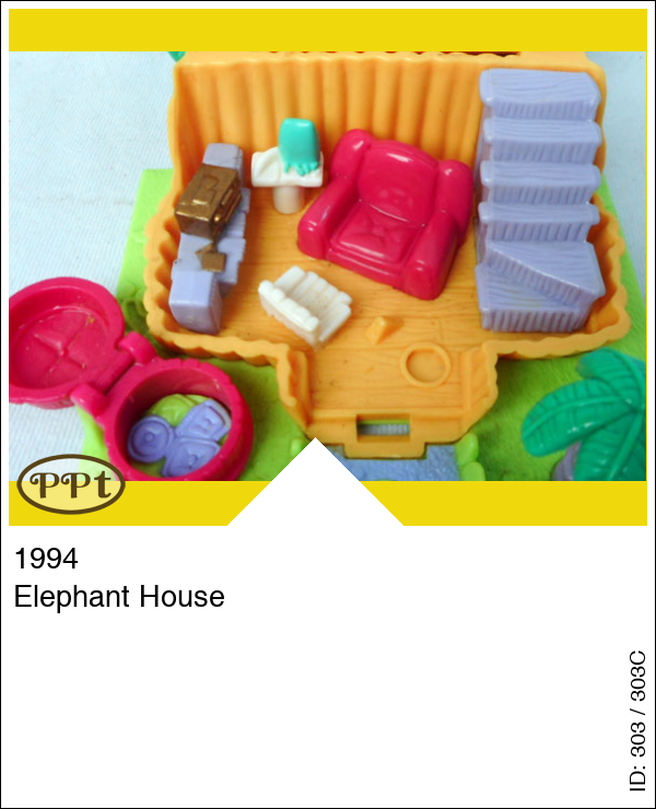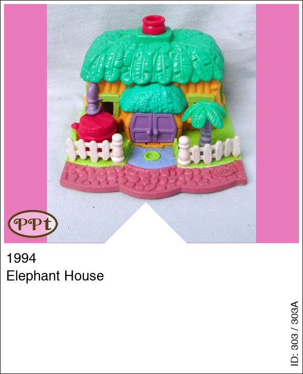 Dit is een andere versie huisje en dan met felle kleurtjes, maar wel net zo leuk, als je het bladeren dakje omhoog doet zie je een huiskamer met radio en boxen, een grote roze stoel en klein wit stoeltje, een trap naar de eerste verdieping en boven is een bad en een weegschaal, tafeltje met spulletjes en een standaard voor de handdoek. Buiten staat nog een regenton welke open kan dit is het huisje van de muis, er is ook een palmboom. Met olifant en zijn saxofoon, Polly met trompet en Madison muis.