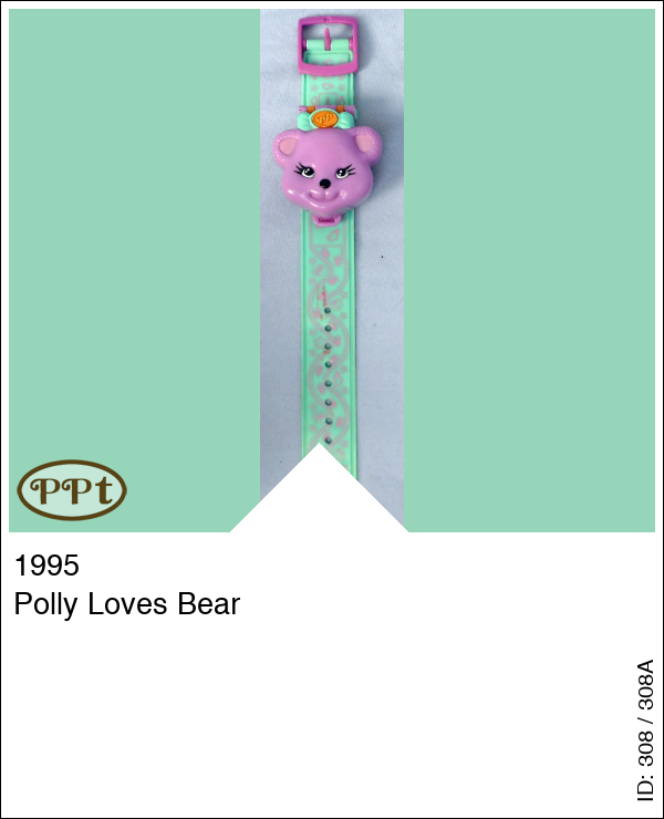 Deze horloge heeft een groene band met versiersels en het horloge zelf heeft het hoofdje van een beer. Binnen het horloge zie je een bos waar de beer leeft en je kan hem voeren. He ziet een tafel, stoeltjes en een picknickmandje wat open kan. Met Polly en een beertje.