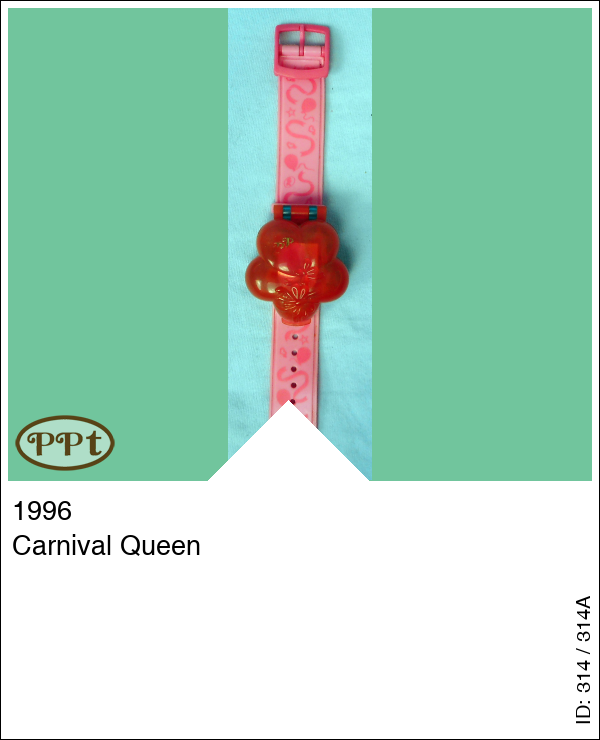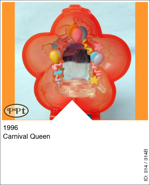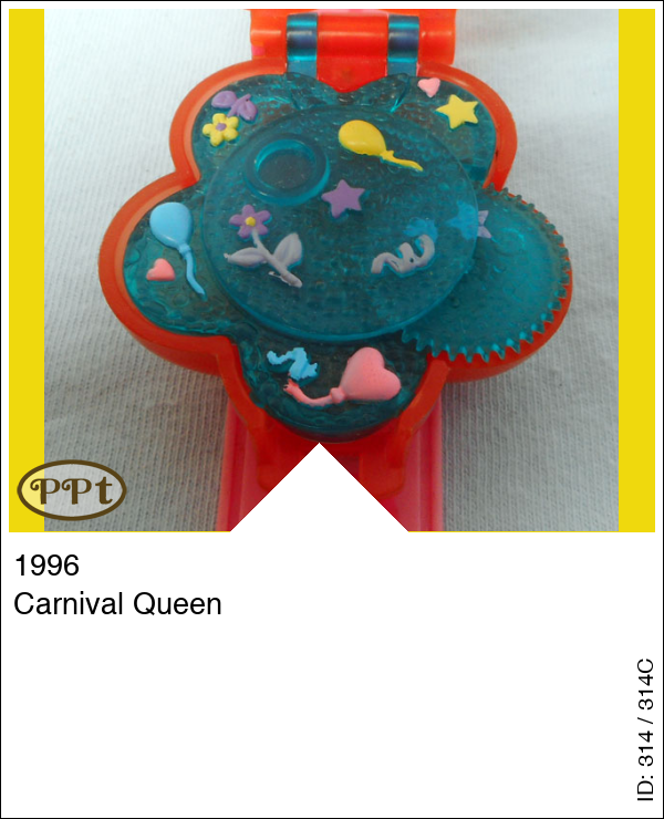 Deze horloge heeft een roze band met versiersels, het horloge is een roze bloem. Binnen zie je een spiegel met een omlijsting van ballonnen en een stukje waar polly op kan gaan staan. Het onderste gedeelte is blauw en ook daar zitten ballonnen en bloemetjes. Ook als je hier polly op zet kan je ze door middel van het wieltje ronddraaien. Onder het blauwe zit ook nog een vakje waar je de losse spulletjes in kan doen.