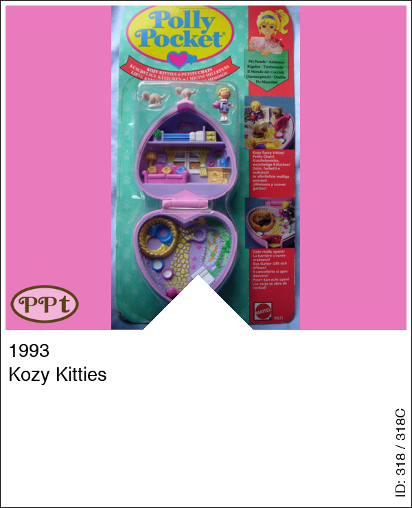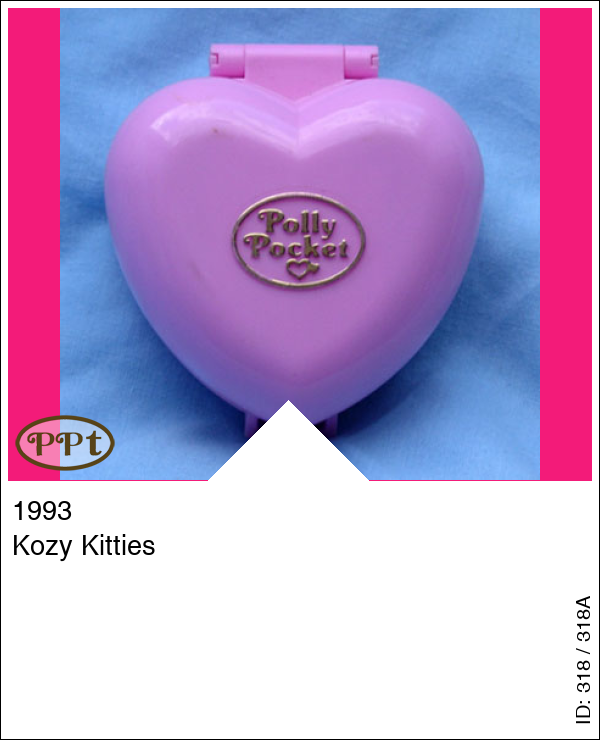Dit is een roze doosje in de vorm van een hartje. Binnen zie je een huiskamer met bank en open haard, en boven is een slaapkamer. Aan de andere kant zie je een tuin met daarin een vijver met visjes en een bankje en ook staat er een mandje met twee poesjes. Met Polly en in haar hand een bol wol.