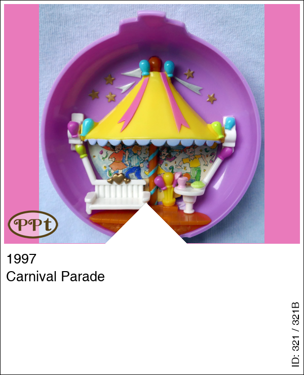 Dit is een doosje met aan de buitenkant ballonnen en slingers. Binnen is dit een geweldig leuk doosje met een verrassing. Het is een kermis met bovenaan een tent en ballonnen, bankje en tafeltje met drinken. Je gaat via een trapje naar beneden en dat trapje kan je dan omhoog doen en dan heb je een poortje. Beneden zie je poortjes van ballonnen, slingers en een bbq met hamburgers en een gedekt tafeltje. De verrassing aan dit doosje is als je de bovenkant van het podium optilt een stempelkussen zit en polly is de stempel. Als je stempelt zie je een vrolijk plaatje van ballonnen en slingers. Met Polly.