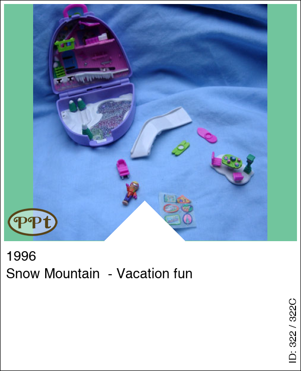 Dit is een paars koffertje met een winterse binnenkant met een skihutje met bed en balkon, een klein glijbaantje te bedienen vanaf de buitenkant en een schaatsbaantje. Het tafeltje is een los onderdeeltje en het sleetje kan ook los.