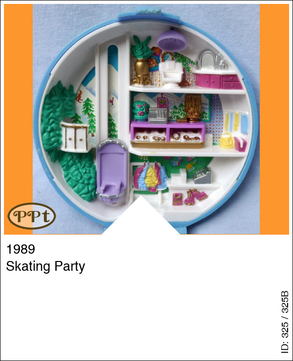 Dit is een doosje met binnen in een winkelcentrum met bovenin een lift, balkon en de bovenste winkel is een kapper, daaronder zit de juwelier met kassa en een vitrine met juwelen en beneden is een kledingshop. De andere kant van het doosje is een schaatsbaan en deze glittert, als je aan het boompje draait dan draait de vloer rond. Je kunt er gezellig wat zitten en dan pak je bij de kraampjes een pizza of wat te drinken of een broodje. Met Polly en vriendin Little Lulu op schaatsen.