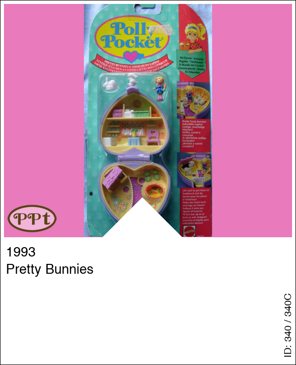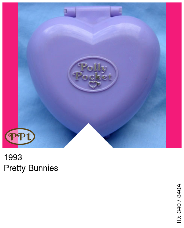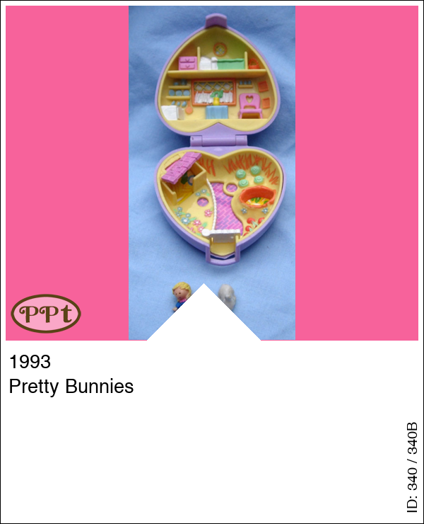 Een lila doosje in de vorm van een hartje met aan de binnenkant boven een huiskamer en slaapkamer en beneden een tuintje met hekje, kropjes sla en een hokje voor de konijntjes. Met Polly en 2 konijntjes.
