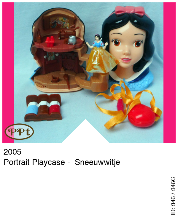 Je kunt het hoofdje open maken en binnenin is een huisje met beneden een foto van hertjes en konijntjes en je kunt sneeuwwitje op een rondje zetten en d.m.v. een wieltje rond laten draaien. Boven is een schilderijtje van de dwergen en een trapje wat je uit kan klappen. Compleet met Sneeuwwitje, gele rok, een afwasbak, bedje (3 naast elkaar), een bezem, emmer en een kookpot. Als extra zit er een halsketting bij met een doosje (vorm appel)en binnenin kan je een foto doen.