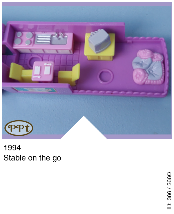 Dit is een paars busje wat paardjes vervoert. Als je het dak openklapt zie je een ruimte voor de paardjes met een klepje wat naar beneden kan en de paardjes eruit kunnen lopen, als je naar de andere zijde gaat is een kussenzithoek met tv en een keukenblokje en zithoekje met tafel en 2 stoelen. Polly en 1 wit paardje en 1 bruin paardje met geel zadel.