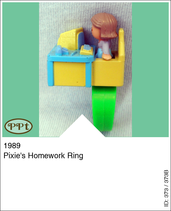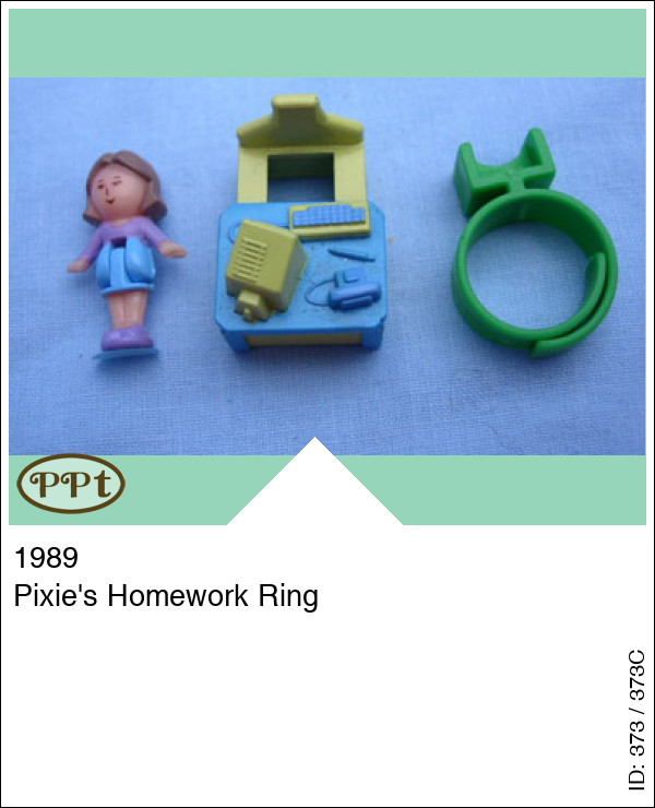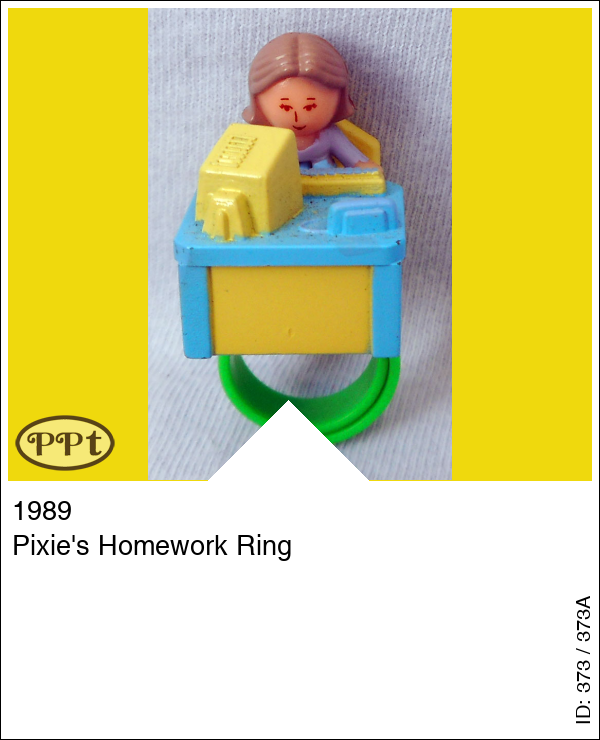 Pixie's Homework RingUpdate: 15-02-2023 Een ring met een blauw tafeltje en gele stoel en op het tafeltje is Pixie haar huiswerk aan het maken met de computer. Met Pixie en de groene ring.