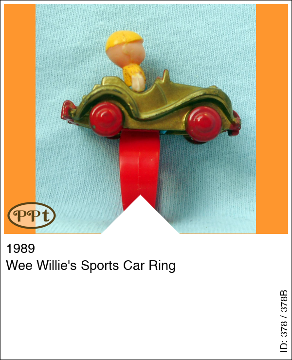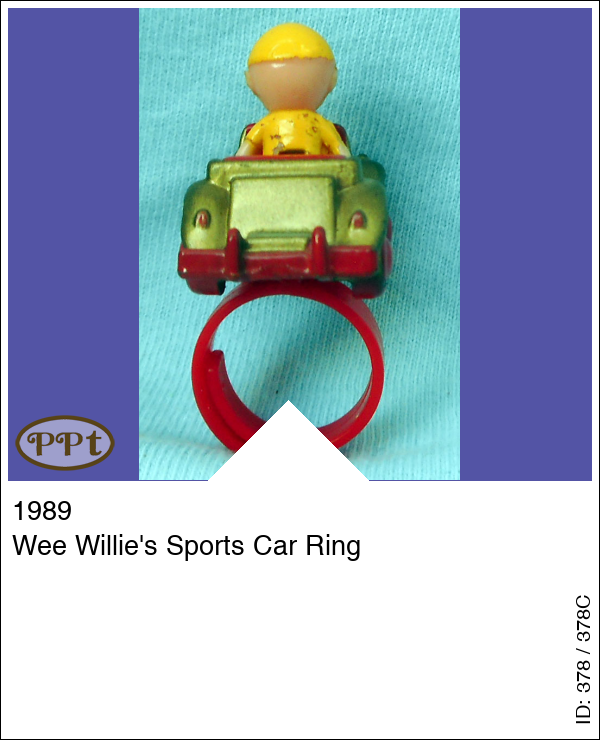 Wee Willie's Sports Car RingUpdate: 21-02-2023 Dit is een ring met een goudkleurige/rode oldtimer auto met Wee Willy en rode ring.