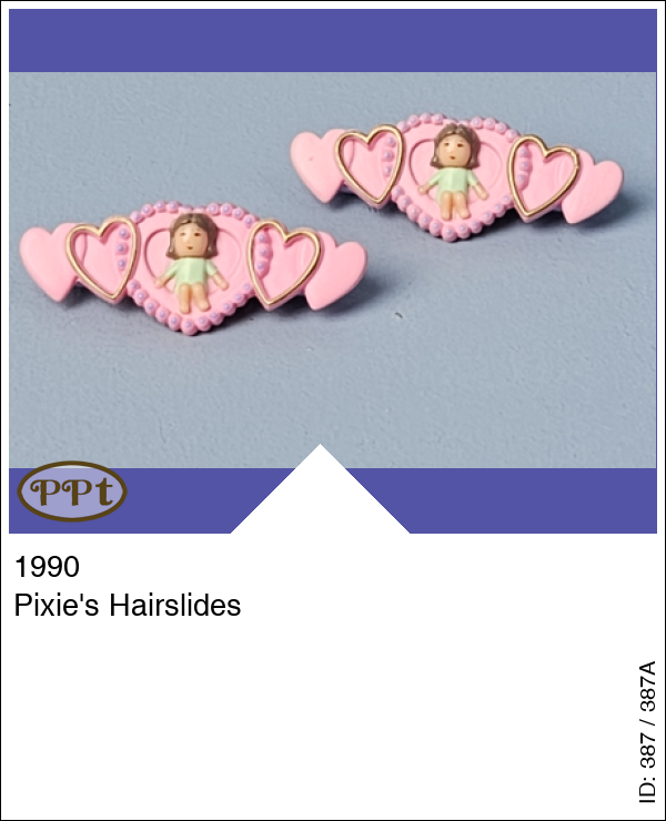 Dit zijn 2 roze haarspeldjes met hartjes en het poppetje Pixie.