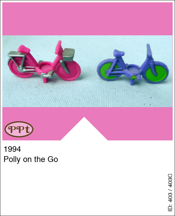 Dit zijn 2 fietsjes. Een paars fietsje en een roze fietsje en daar zit een mandje voorop. Met Polly op skates, Daisy met witte helm en Michelle met groene helm.