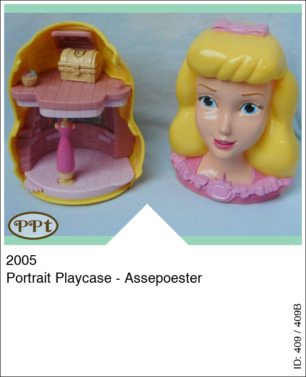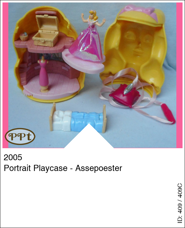Je kunt het hoofdje open maken en binnen in is een huisje met beneden een foto van assepoesters koets. Je kunt assepoester op een rondje zetten en d.m.v. een wieltje rond laten draaien. Boven is een schilderijtje en een plateautje wat je uit kan klappen. Compleet met Assepoester, paspop om haar jurk aan te hangen, mandje met garen, een kist en een bedje. Als extra zit er een halsketting bij met een doosje(vorm kussen) met daarop een schoentje en binnen in kan je een foto doen.